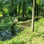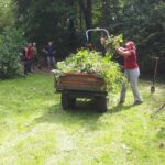 De afgeknipte takken worden verzameld en aan de kant van het pad gelegd, zodat Kees er met de hakselmachine gemakkelijk bij kan.